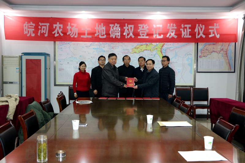 经垦地主管部门协商一致,确定皖河农场国有土地使用权证由怀宁县国土局不动产中心登记发放,农场紧抓时机有效对接,及时提交确权发证所需资料,按场区地形及主干道分布划分11块宗地制作国有土地使用权证,总面积约7115万平方米,其中农地面积约5696万平方米,最终于2017年底在安徽垦区率先一次性完成土地确权发证。(徐丽燕)
