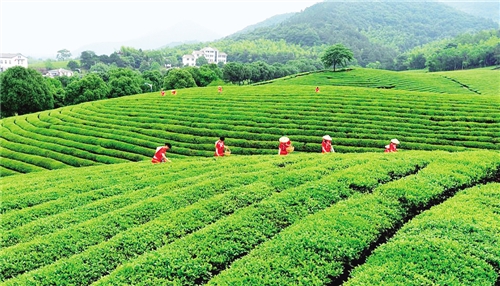 6月的皖南,正值夏暑茶收获的季节。在敬亭山的万亩茶海中,一排排茶树青翠欲滴、紧密相连,从山顶俯望下去,好似梯田般错落有致。其间,几位身着红衣的女工正在采茶,红绿相间,勾勒出一幅独具江南韵味的“采茶图”。